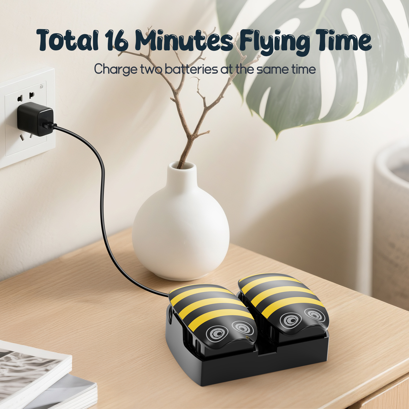 Supplied with two batteries, each lasting around 8 minutes when fully charged allows the total flight time to be around 16 minutes. The included charging dock allows both batteries to be charged at the same time, making charging more convenient.